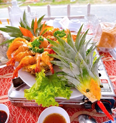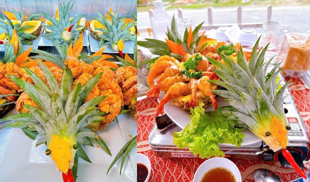 Từng con tôm được xếp gọn gàng trong lòng trái thơm, phủ lên lớp nước sốt trắng ngà bóng mịn, điểm thêm chút rau thơm xanh mướt, đôi khi là vài lát ớt đỏ tươi cho thêm phần nổi bật.