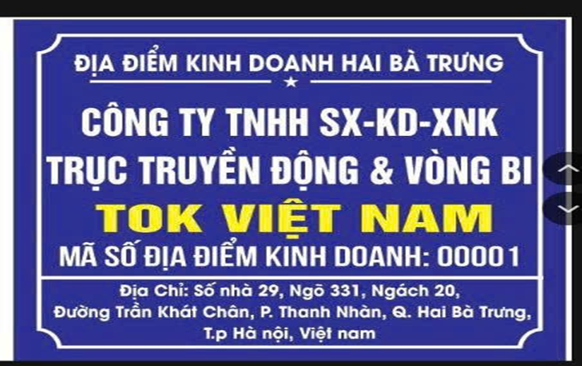 CÔNG TY TNHH SX-KD-XNK TRỤC TRUYỀN ĐỘNG & VÒNG BI TOK VIỆT NAMĐịa chỉ : 9/331/20 Trần Khát Chân, phường Bạch Mai, Hà Nội