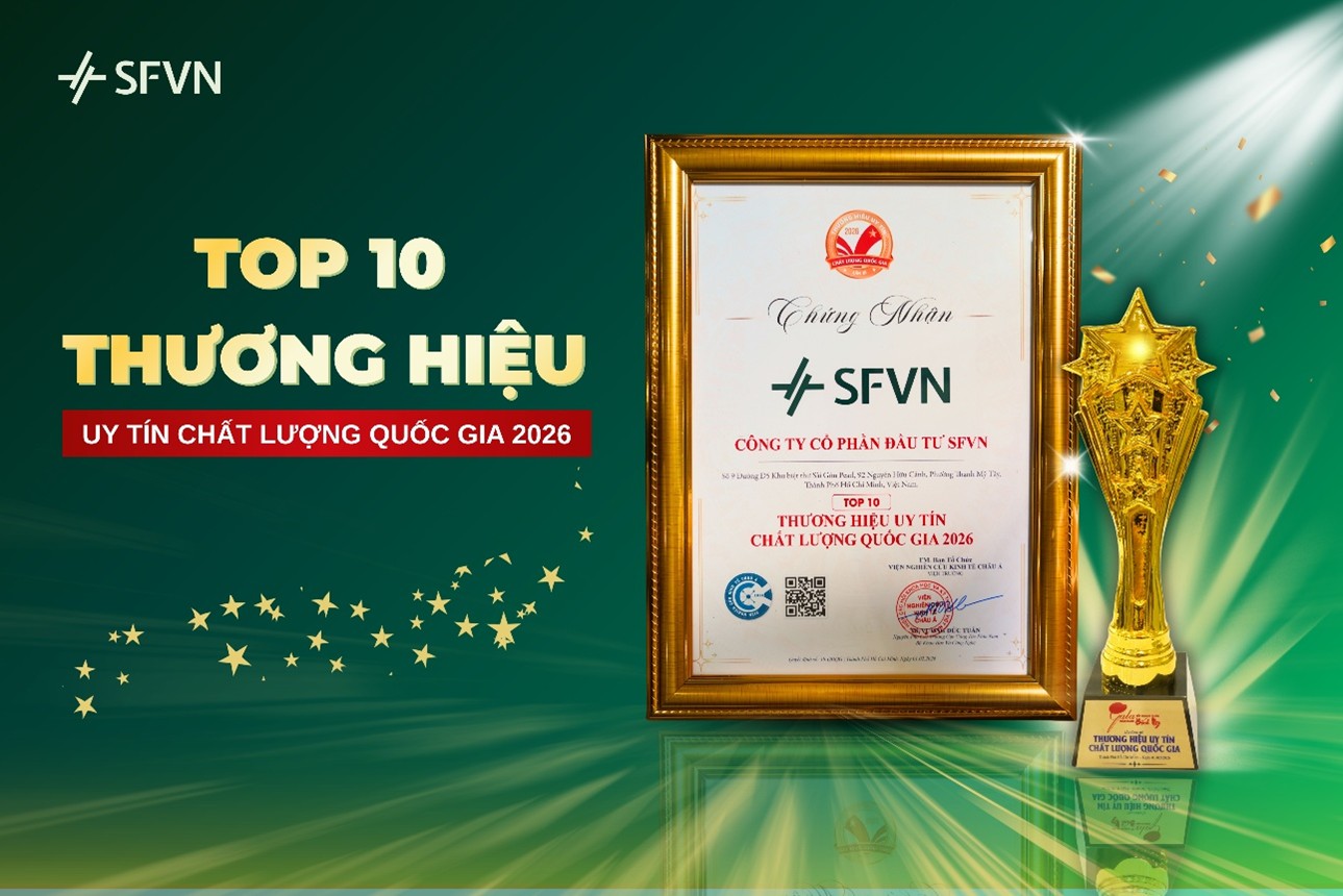 Ngày 01/02/2026, Công ty Cổ phần Đầu tư SFVN đã được trao chứng nhận “Top 10 Thương Hiệu Uy Tín Chất Lượng Quốc Gia lần thứ XI – Năm 2026” do Viện Nghiên Cứu Kinh Tế Châu Á tổ chức.